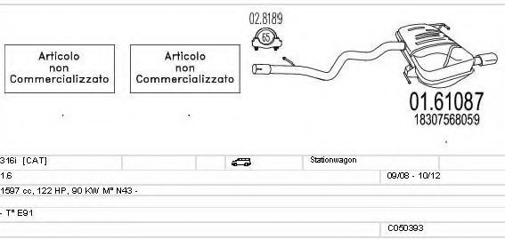 Система выпуска ОГ ► Раб. объем (округленный) - 1,6; вар. оснащения - Stationwagon; Г. вып. от - 09/2008; раб. объем (точн.) - 1597; код двигателя - N43; тип модели - E91; Исполнение днищевой планки - Kat; мощность - 90 |
