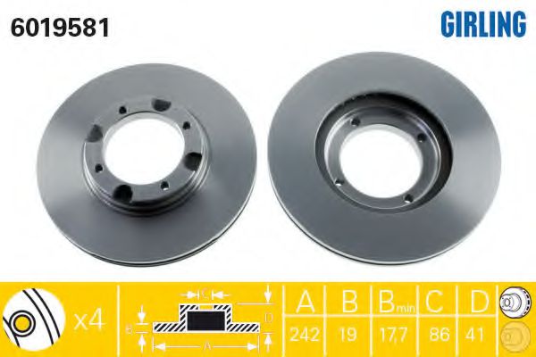 Диаметр [мм]: 242 Толщина тормозного диска (мм): 19,2 Минимальная толщина [мм]: 17,7 Количество отверстий: 4 |